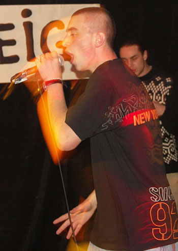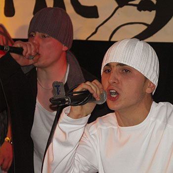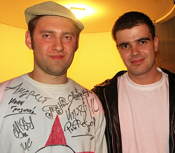 © Фото: А. Б. "Доктор Бро и Вадим" Что хочется добавить? Пришел как унылый чужой, уходил веселый и позитивный. Не ждал высот классицистической поэзии, но услышал живые голоса и ощутил лихой драйв, которого так не хватает на стандартных алкогольно-похмельных рок-концертах. «Фу, Твердислав, – возразят эстеты, – взгляни на этот усыпанный бычками пол... А где же дизайн, пиар и креатив?» Пол подметут. А на следующий митинг я обязательно приеду вовремя. П.С. Я послал Боре пять вопросов, и ответный емэйл пришел точно в тот момент, когда закончил текст, который вы только что прочитали. Вот эти ответы. Сколько тебе лет, как давно живешь в Германии, как твое имя - Борис ... , а также под каким псевдо ты выступаешь в качестве рэпера? Мне 17 лет, в Германии 2 года, меня зовут Борис Кауфман (прямо отчет пионера). В народе известен как М.А.Д. (ака Мухаммед Ади Дазз, можно просто Мух, Мэд и так далее) или ПИ – ПсевдоИроник, но про ПИ мало кто знает. Ты был одет в черный костюм с восточной символикой - ты увлекаешься единоборствами или следуешь стилю Ву-Танг-Клана? На самом деле, там никакой восточной символики не было. Это был костюм RocaWear модели 1999 года. Раритет, ё-моё! Wu-Tang люблю, но копировать не умею. Только как-то с командой, из которой я нынче ушёл, попридумывали такие фишки с именами, как Method Mooh, fRedman, Ghostface Kenny, Ol' Dirty Chuck, Capparomma и т.д. В приколюхе участвовало около 20 человек. 36 не набралось... Кого из русскоязычных рэперов Германии или России ты уважаешь больше всего? Ну... Это разные категории... В Германии уважаю команды «Преферанс», «Тёмный Переулок», «Ниггативные», Berlin Burner Production (кстати, из Берлина), «Трилогию» (тока они куда-то пропали, давно ничего от них не слышал). После митинга к этому списку прибавились Hypnose, «Стигмата», Lux Bros. Так держать всем! А в России... «Каста» (куда же без неё!), П-13 (хотя не совсем Россия), Zu Fam, краснодарским всем – респект, «Крестная Семья» и ЕК-Playaz (землячки). Эти люди умеют делать своё дело. Как давно ты на сцене? Читать (точнее, пробовать читать) я начал году в 1999, тем годом датируются первые записи... А на сцену по-настоящему вышел только в этом году... Чем занимаешься по жизни? Сейчас я активно занят разжиганием ненависти в себе к остальному миру... Только ничего не выходит... Мир такой хороший... Надо заканчивать это... А так... Со следующей недели – курсы немецкого, на выходных начнем деятельность с моей новой командой (то есть создавать её). Кстати, мне товарищ сказал, что мы в Берлин едем выступать скоро... П.П.С. Спасибо Доктору Бро (https://home.arcor.de/d-rbro/) за приглашение, а так же форуму www.rus-rap.de, откуда я взял информацию о выступавших на митинге.