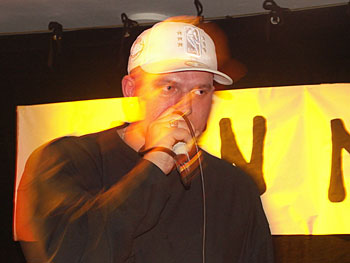 © Фото: А. Б. "Сергей из группы "Гипноз"" А в зале начинался баттл – не обязательная программа, где показывают домашние заготовки, а импровизация под «минус». В дисковод втыкается «сидюк» с заранее записанным ритмом и сэмплами в минималистической обработке, сверху в живом режиме накладывается вокал. Вышел Доктор Бро. Он читал с интересной интонацией, выдавал голосовые «спецэффекты» – чирикал, мяукал и присвистывал, короче, держался уверенно и профессионально. Дело продолжили сразу несколько человек. Запомнился худой юноша из Таллинна, отличавшийся резкой пластикой: двигался по сцене как железный дровосек, рубя воздух ладонью. Его манера чтения напомнила ямайских дансхолльщиков, но вездесущий Доктор Бро, который вновь был рядом, горячо уверял, что я ошибаюсь. Затем другой молодой рэпер начал мощно грузить что-то за правду жизни, но я не разбирал слов. («Его зовут Андрей, – шепнул Бро, – он много тренируется, но первый раз выходит на сцену».) Вообще на этом митинге было не очень со звуком – скажем так, чел за пультом отрабатывал, но не работал. Мимо нас по-кошачьи скользнула серая тень. («Это Сергей из берлинской группы «Гипноз», – кивнул Бро в сторону тени, – он важную роль сыграл в подготовке митинга».) А на сцену вывалились двое тинэйджеров. Они ухмылялись чересчур весело и пробовали читать по очереди: один все время забывал слова, второй восполнял отсутствие внятного текста задушевным русским фольклором.