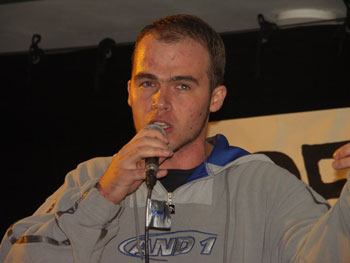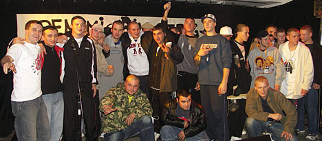 © Фото: А. Б. "Боря M.A.D." В тот миг, когда уже собрался ехать домой инспектировать подушку и одеяло, на сцене материализовался паренек в черном спортивном костюме с китайскими драконами, в смешной панамке и с золотой цепью на шее. «Угу, – хмыкнул я, – очередной псевдониггер!» А парень принялся виртуозно сыпать рифмами, убийственно высмеивая соперников, он улыбался и пританцовывал, как балансирующий на канате акробат с завязанными глазами. Он знал свою тему на такт вперед. На сцене толпилось множество представителей рода человеческого, все читали вперемешку, многие неплохо, но основная дуэль разворачивалась между «черненьким» (в зале народ кричал: «Дайте черненькому поговорить!») и «беленьким» (этого я так окрестил за белую тишортку, хотя правильнее было бы назвать его пьяненьким). Беленький матерился и угрожал сопернику физическим насилием, а тот только смеялся и отшучивался. Что творилось в зале! Публика пришла в экстаз. Люди танцевали, хлопали, хохотали. И тогда кто-то из авторитетных важняков выхватил микрофон у зазевавшегося беленького и возгласил победу Бори из Магдебурга (позже я узнал, что его боевой псевдоним – M.A.D). На этом митинг закончился. Все стали расходиться.