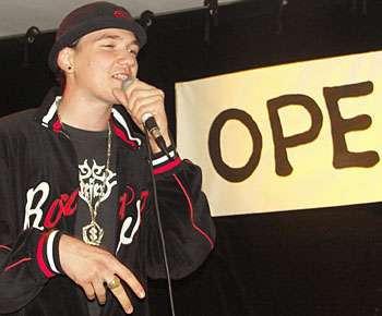 © Фото: А. Б. "У открытого микрофона" Честно признаюсь, мировая хип-хоп-культура лишь краем крыла задела вашего корреспондента. Редко какой трек дослушиваю до середины, редко какой клип с бесконечными «телками» и «тачками» досматриваю до конца. Однако есть реальные мастера «ритмической американской поэзии» (говорят, именно так расшифровывается слово RAP), перед их величием скромно снимаю свой скальп. Далее, собственно русский рэп часто зануден, темы неглубокие, строки корявые, понты беспредельные. Сегодня рэпером норовит заделаться каждый убогий школьник: наслушается Эминема, нацепит позолоченную цепарочку на прыщавую шейку, напялит бейсболочку с километровым козырем. Что тут скажешь? Дети! Домой, к маме! Однако есть люди, которые взяли эту форму и вдохнули в нее уличный ураган.