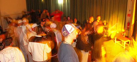 © Фото: А. Б. "Серьезная тема" Шпандау далеко. Туда добраться нелегко. Все началось часов в девять, но – не был, не участвовал, не принимал. Опоздал. Пропустил выступление Доктора Бро из Франкфурта-на-Майне, который меня и пригласил. НЕ БЫЛ свидетелем шоу, которое устраивали Lux Brothers из Дюссельдорфа, «Преферанс» из Радеборна, берлинский проект Hypno$e и NuCLEAR из Ансбаха, группа Nostra из Любека, Bobize from BBP и Хардкор, Illegale Emigranten из Магдебурга, «Темный Переулок» из Крефельдта и Иван Грозный (откуда он? увы, мне это неизвестно), «Стигмата» из Берлина, Crime City из Крефельдта. Я ЭТОГО НЕ ВИДЕЛ! НЕ СЛЫШАЛ! Позор на мою шипастую башку. Успел лишь на самый последний номер официальной программы, который не очень понравился. Потом возникло нечто вроде паузы, и тут по ярко раскрашенной майке я узнал Доктора Бро.